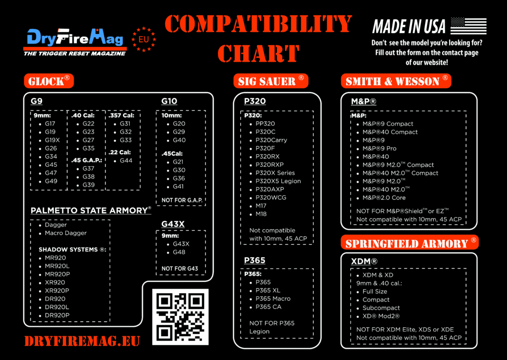 We currently offer the DryFireMag for most Glock full frame pistols, Glock 43X & 48, Springfield XD, Smith & Wesson M&P, and Sig Sauer P320. Some Magazines are compatible with different Pistol Manufactures , hence you may find them present in multiple selections. Also some magazines will work only with a specific model within the brand. We try to be as clear as possible, if you are in doubt please contact us !